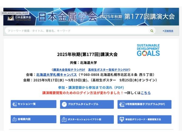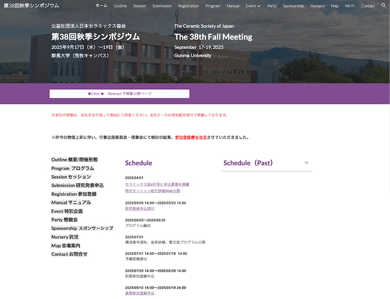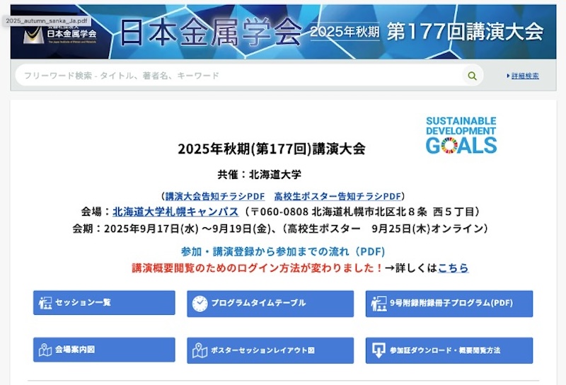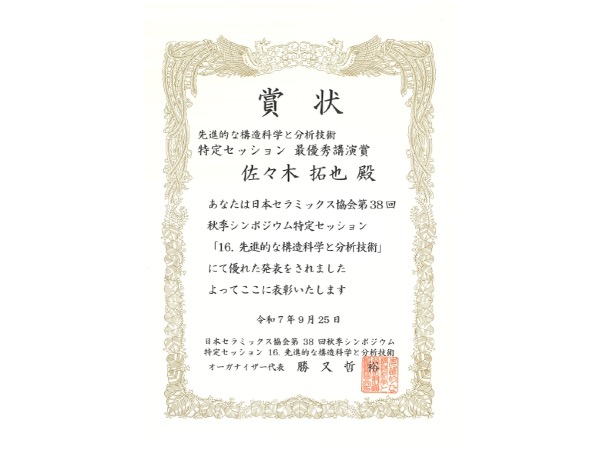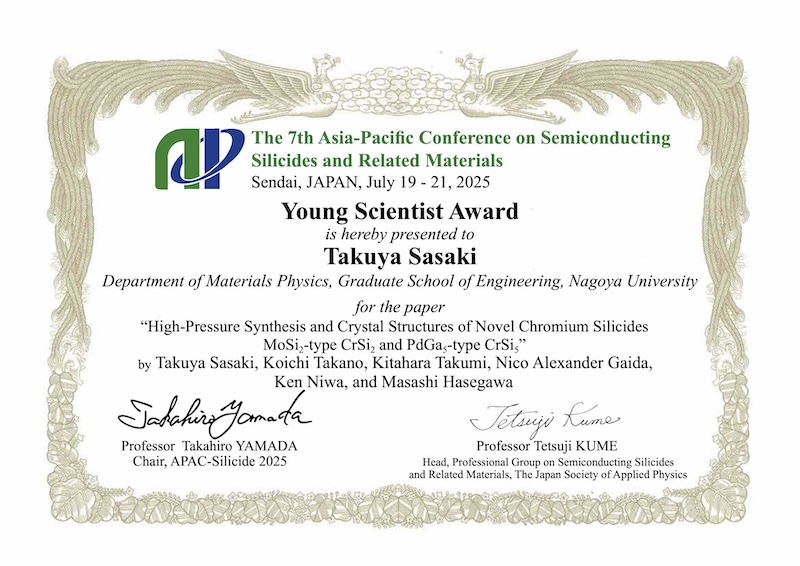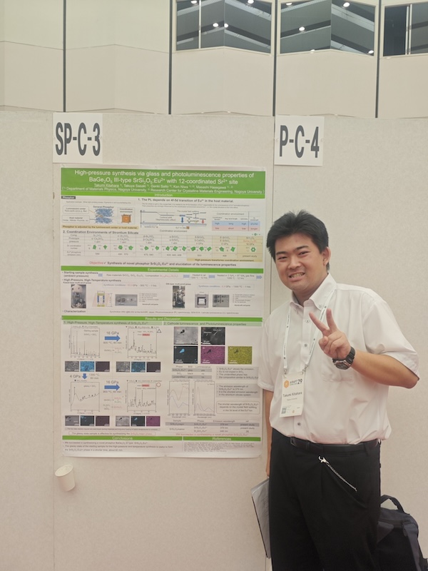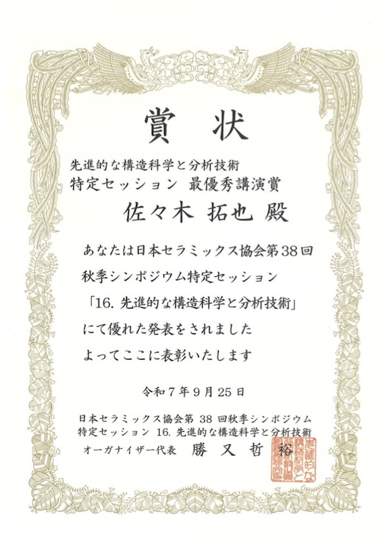 2025年9月28日-10月19日AIRAPT-29@愛媛県県民文化会館 研究成果を発表しました. 2025年9月25日日本セラミックス協会 第38回秋季シンポジウム 特定セッション「先進的な構造科学と分析技術」最優秀講演賞 受賞!! 2025年9月17日-19日日本セラミックス協会 第38回秋季シンポジウム@群馬大学 荒牧キャンパス 研究成果を発表しました. 2025年9月17日-19日日本金属学会 2025年秋季(第177回)講演大会@北海道大学 札幌キャンパス 研究成果を発表しました. 2025年8月6日祝!論文アクセプト D1北原くんとOB浅野くんの論文受理・出版の祝い 2025年7月19-21日APAC Silicide 2025@東北大学 片平キャンパス 研究成果を発表しました.受賞しました. 2025年6月24-25日第7回固体化学フォーラム研究会 & ISSPワークショップ@東京大学 柏キャンパス 研究成果を発表しました. 2025年度メンバー 学生とスタッフ総勢21名(2025年4月24日 EI館前にて撮影)1年間楽しく頑張りましょう.